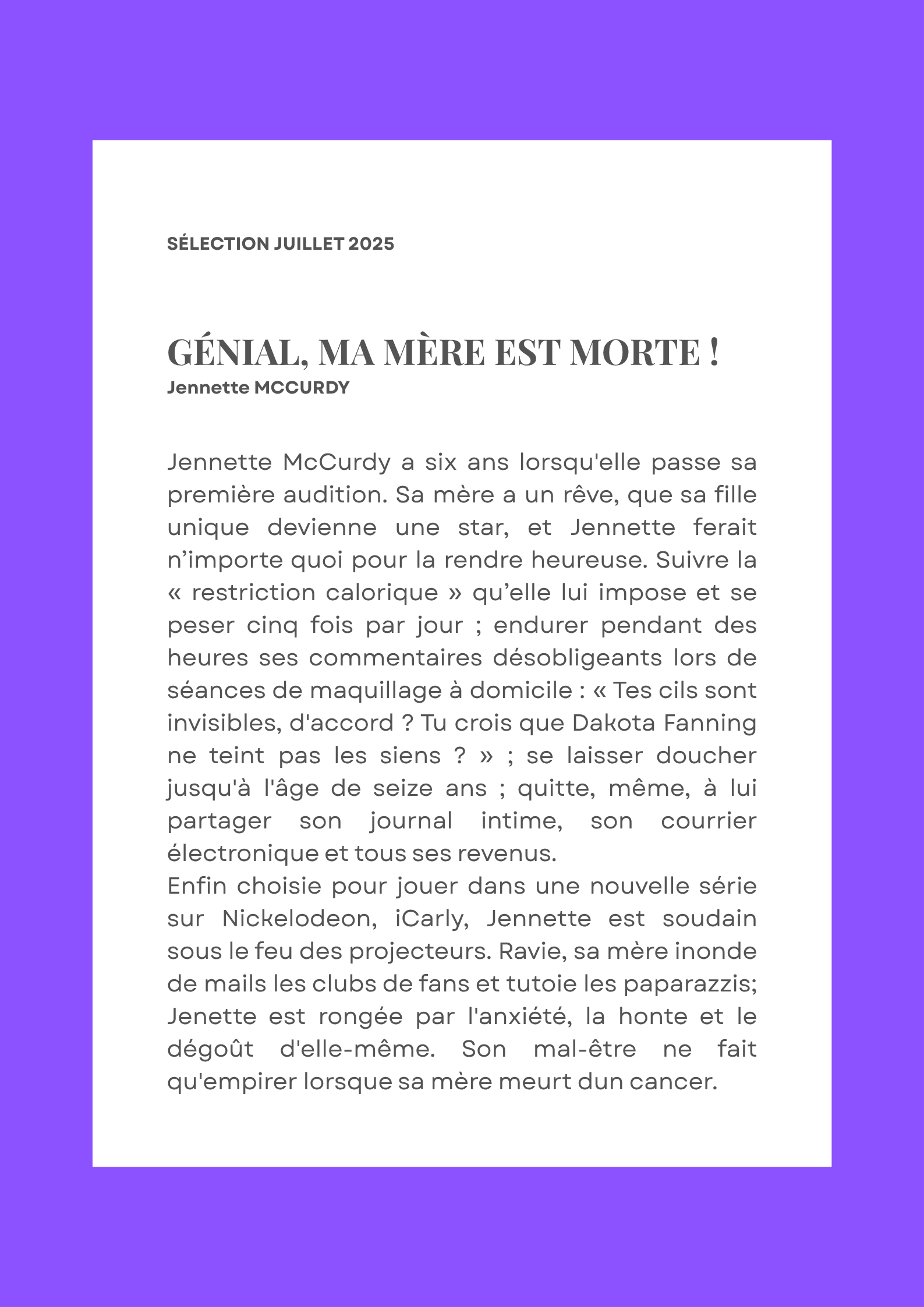 BOOK CLUBSélection – Juillet 2025par Lisamis à jour le 17 novembre 202517 novembre 2025Laisser un commentaire sur Sélection – Juillet 2025 COMMANDER EN LIGNE ÉCOUTER L'AUDIOBOOK TÉLÉCHARGER L'EBOOK VOIR LA VIDÉO SUIVRE L'AUTRICE AUTRES PARUTIONS